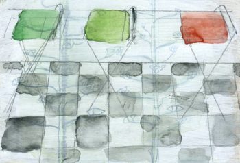 3 Stühle in der Kirche (Anafi) 2011-Mischtechnik 10x15cm